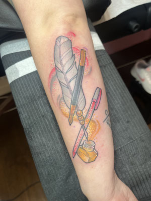 My art style is bold and illustrative. I love to tattoo dinosaurs, pop culture themes (especially Pokemon!), cute animals, florals, anything covered in rainbows and glitter, and of course Taylor stuff!